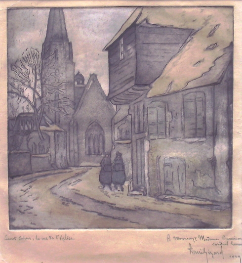 La rue de l'église à Saint-Calais, gravure sur zinc, coll. part.