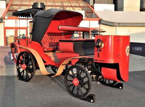 L'audace de sa conception fait sensation auprès du public parisien à l'Exposition universelle de Paris au Trocadéro. C'est une victoria à vapeur dont la chaudière est située à l'arrière et le moteur à deux cylindres, à l'avant. Elle peut transporter huit passagers, plus le chauffeur installé à l'arrière. Les dames sont bien à l'abri sous la capote, les messieurs à l'avant à côté du conducteur. Avec deux kilos de charbon et quelques litres d'eau, elle parcourt un kilomètre à une vitesse de croisière de 40 km à l'heure. A l'issue de l'Exposition où elle a obtenu une médaille, la Mancelle est hissée sur un wagon à destination de l'Autriche où elle émerveille la foule et promène l'empereur François-Joseph dans les allées de sa résidence de Schönbrunn.